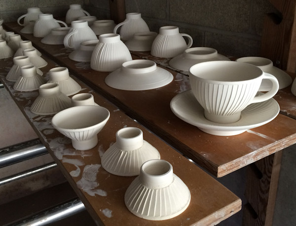 It has always been music to our ears when someone tells us they enjoy using our pottery. Functional pottery is tactile and needs to be used to be fully appreciated. But handmade pottery is relatively expensive; some shapes more expensive than others, and not always for obvious reasons. An example of this would be teacups and saucers, more appropriately called cups and saucers. Breakfast cups and saucers are used for coffee these days, or a comforting bowl of chicken soup. Saucer'd cups have been made for a thousand years; some beautiful examples from Chinese and Korean history are wine and tea cups with saucers. The western world didn't just get tea from China; we got "china" from China (now of course we get everything from China). A couple of hundred years ago, English teacups and saucers were just for the upper class. My own mother, working class and old fashioned (she was born in 1908), would have afternoon tea parties with her best bone china teacups and saucers. For most of us, slopping a dribble of tea isn't a problem, but if one is dressed up for afternoon tea, one can see the usefulness of a saucer. But why are they so danged expensive? In fact, we try to keep the price lower than it might be, just so we can sell them. Both the cup and saucer take more time to make than an ordinary mug. In addition, they are fraught with difficulty. The foot of the cup has to fit into the indentation of the saucer. The both have to come out of the kiln in good shape too. If just one of them is a "second" the set becomes a "second" or worse. There definitely is, for a potter at least, many a slip twixt the cup and the lip.