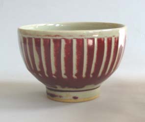 The colour photo of the fluted bowl above has a glaze known as copper red or sang-de-boeuf. This glaze is another famous Chinese invention and is one that, until recently, I hadn't really liked. It can be too showy, so bright that it looks like paint. Although copper is a potent colouring oxide (there is only 1/4 percent in our red), the colour can be difficult to achieve, tempermental and fugitive. The atmosphere in the kiln, the speed of cooling, and the thickness of the glaze are all factors affecting it. When this glaze is imperfectly fired, you can find the full range of colour, from the pale green of the base glaze to red or plum. I find this contrast, although considered a defect by some, much more attractive.